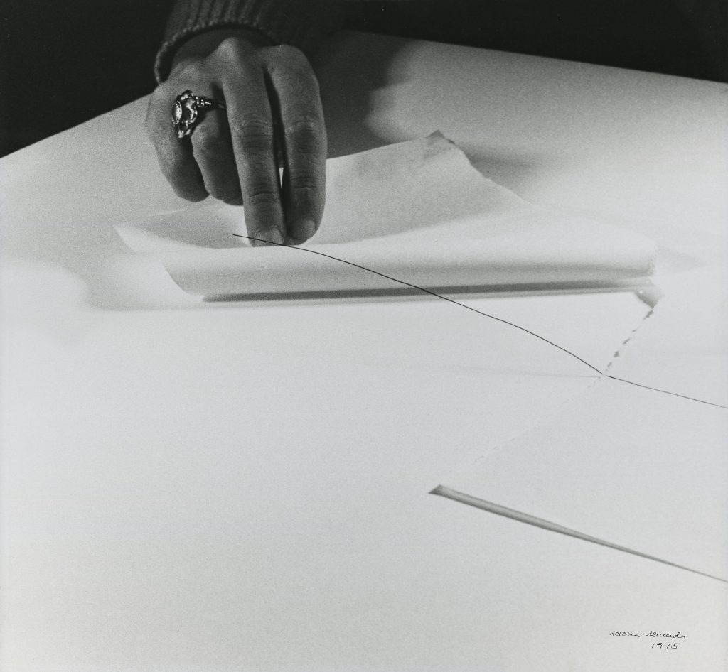 Helena Almeida, "S/T", 1975, fotografía en blanco y negro con línea dibujada en tinta india. 39 × 41 cm; 43 × 45 × 3 cm (enmarcado). Fotografía cortesía de Prat Nogueras Blanchard, Barcelona.