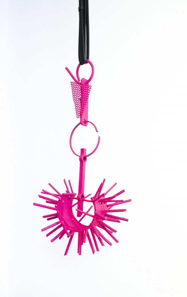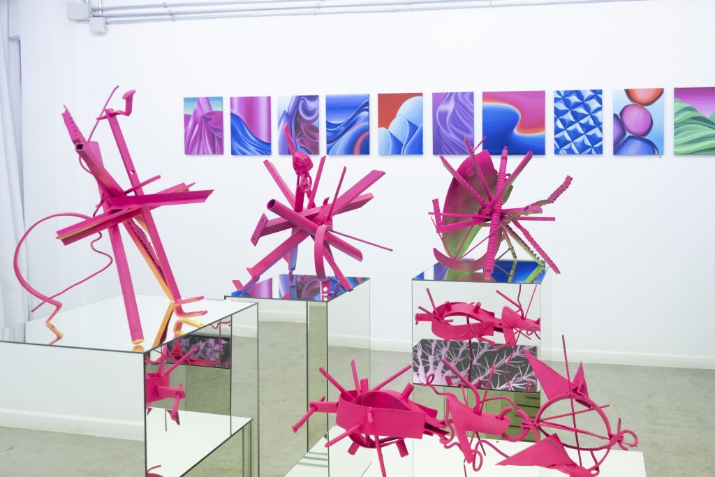 Su uso intensivo de tonos rosas y fucsias, lejos de caer en la estética amable que esos colores suelen evocar, se torna chirriante y abrasivo. Es una flor que hiere, porque funciona como mascarada de una violencia estructural: alambradas miniaturizadas, formas punzantes, superficies que reflejan al espectador como si este fuera parte del dispositivo. En sus piezas, la flor deja de ser símbolo de vida para convertirse en un residuo de un mundo que industrializa incluso aquello que le resulta más frágil.