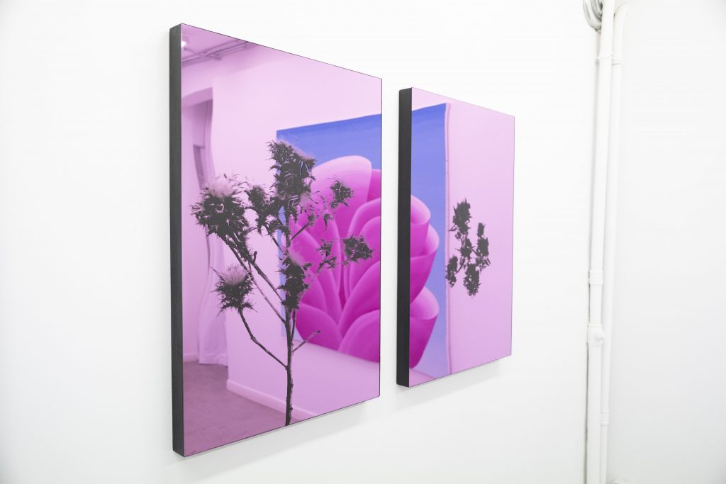Frente a esta visión, Jorge García propone un jardín de naturaleza completamente distinta: un jardín manufacturado, casi bélico, donde los materiales industriales (metales, superficies espejadas, impresiones de alto contraste) convierten la belleza floral en un gesto ambiguo. Lo que en principio podría leerse como un homenaje visual al color y la luminosidad, incluso a lo kitsch, termina revelando una pulsión inquietante: la tensión entre seducción y amenaza.