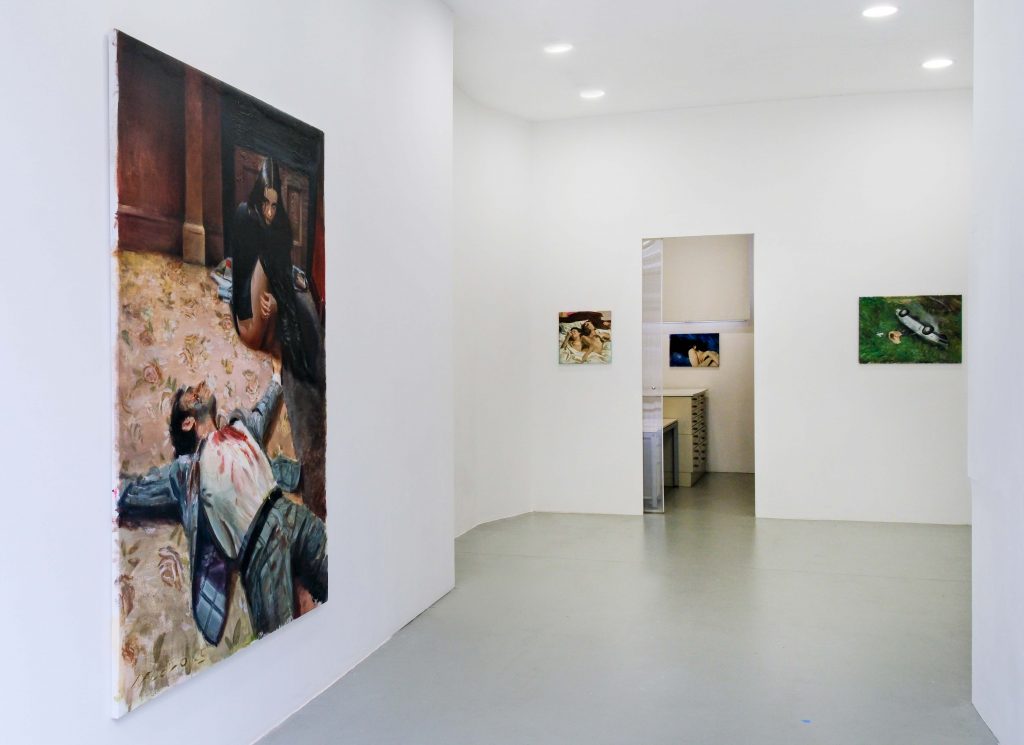 La pintura que toma el cuerpo humano —con sus luces y sus sombras— y su intimidad desvelada como topos literario construye imágenes cercanas, reconocibles, extrañas si atendemos a la visión despersonalizadora de Mircea Cărtărescu. Esos cuerpos oferentes de Iván Floro (Barcelona, 1993), que nos devuelven la mirada, “son expresiones de un gusto estético situado más allá de la alegoría, que ejecutan con maestría la nosología de una época como la nuestra, que se articula en unidades binarias: dentro/fuera, llave/puerta, sosiego/tensión, ternura/arrebato. El resultado es un ejercicio de compresión de unos cuerpos exasperados o expectantes, antes o después del sexo, estáticos o dinámicos, pletóricos de pasión por la vida o asustados por la pérdida de la llave que les impide regresar al núcleo originario; un ejercicio de comprensión realizado por la fecunda imaginación de un pintor que sabe extraer sentimientos de la libido a la medida de lo bello”, tal como reza el texto curatorial de Almudena Blasco Vallés [1] sobre la exhibición individual de Floro en la galería bilbaína SC Gallery,compuesta por un diálogo entre pinturas de diversos tamaños.