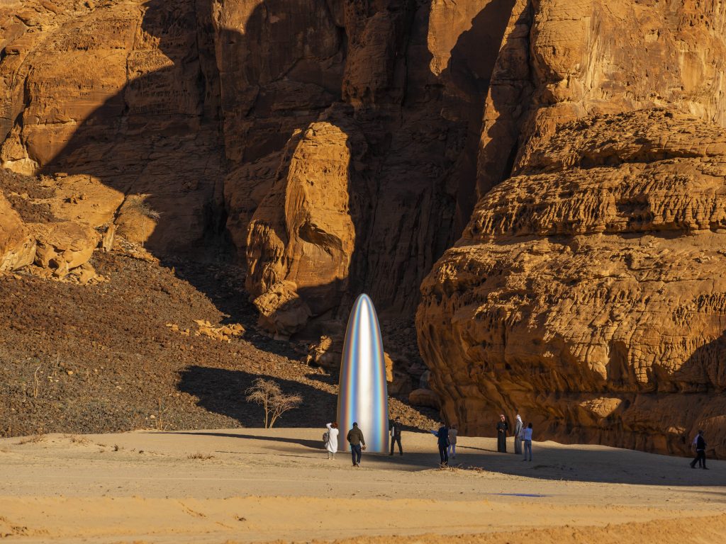 Gisela Colón. DESERT X ALULA, "The Future Is Now (Parabolic Monolith Iridium)". Fibra de carbono aeroespacial revestida con pigmentos dicroicos minerales, 25 × 8 × 10 pies (7,6 × 2,4 × 3 m). Activación del desierto de Medina, del 31 de enero al 7 de marzo de 2020. Al-Ula, Arabia Saudí. Comisariada por Neville Wakefield, Raneem Farsi y Aya Alireza. Fotografía por Lance Gerber, cortesía de la artista.