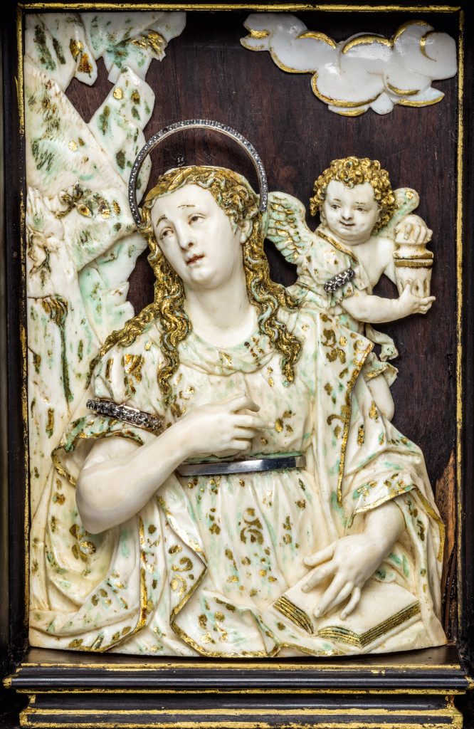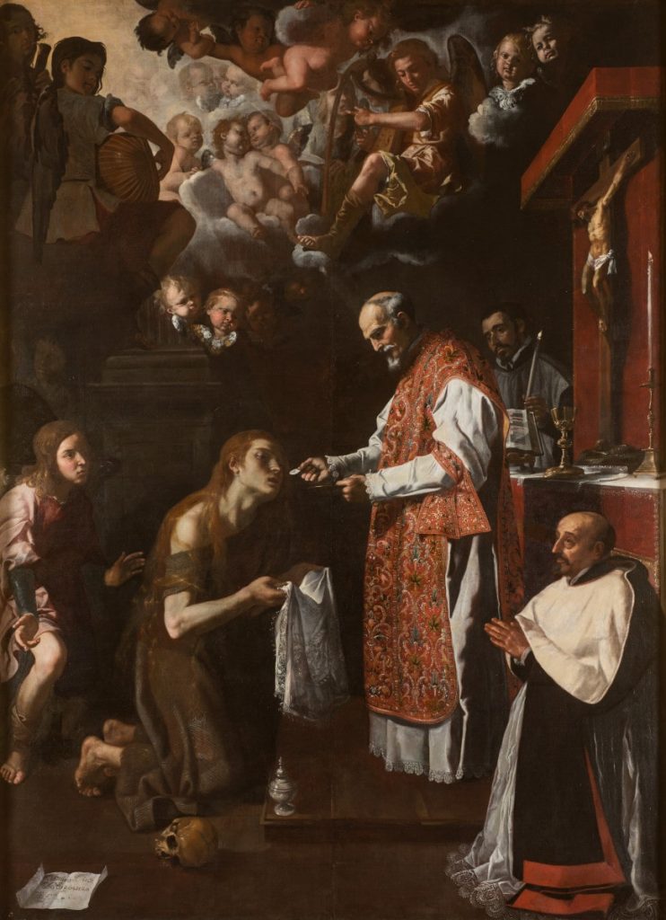 Un ejemplo paradigmático es La última comunión de María Magdalena (1665), de Jerónimo Jacinto de Espinosa, donde el dramatismo contrarreformista convierte —literalmente— su cuerpo penitente en escenario de una exuberante exaltación sacramental. La calavera, el tarro de perfumes y la melena desbordada insisten en un relato bíblico donde se ensarta la emoción, el arrepentimiento y la carne que se (auto)disciplina, personificando en María Magdalena la redención y la belleza de la renuncia.