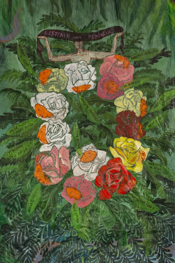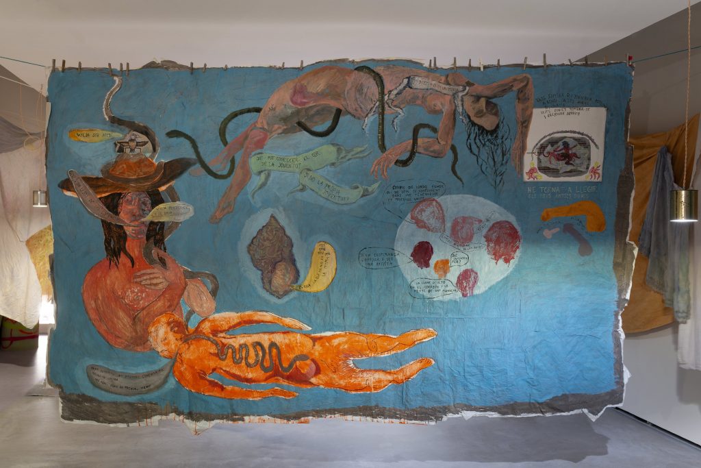 Popea (Santanyí, 1977) evoca su etapa como estudiante de Bellas Artes en la Facultad de Cuenca en la década de los noventa a través de pintura, escritura, sonido, acción colectiva y lecturas en voz alta: “telas teñidas con elementos naturales”, periódicos reutilizados o “cuadros antiguos” entremezclados con la arquitectura emergente, construyendo así un nuevo tejido memorístico, colectivo y ahora compartido, como un telar con el público que asiste a la exhibición, convertido en memoria común del tránsito de la artista balear.
