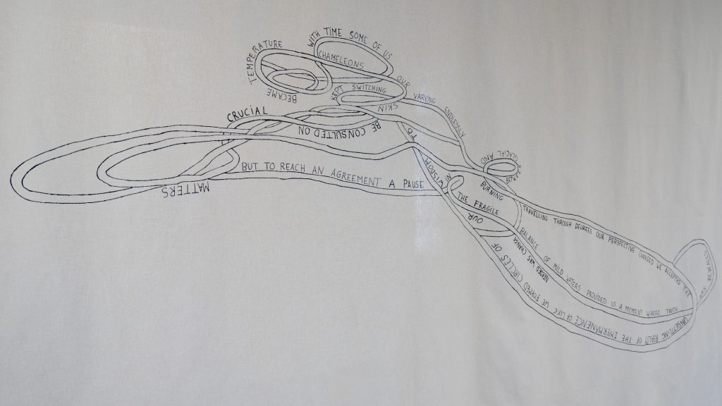 Esta exposición colectiva, comisariada por Lucía Caballo[1], es un precioso ejercicio de entretejer las realidades contemporáneas desde la generación que la avala, desde los lenguajes y las experiencias vitales, desde ese lugar donde han coincidido todos y todas: desde los lugares que todavía no existen, pero ya anuncian su posibilidad.